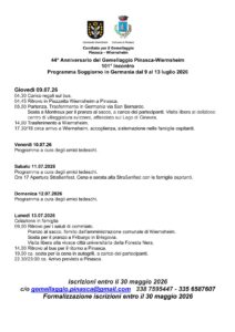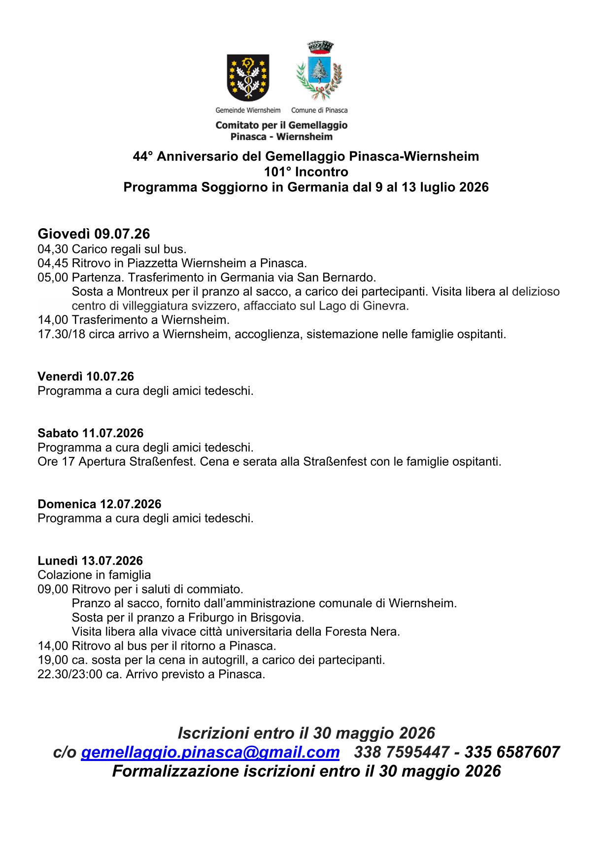 44° Anniversario del Gemellaggio Pinasca-Wiernsheim – 101° Incontro – Programma Soggiorno in Germania dal 9 al 13 luglio 2026